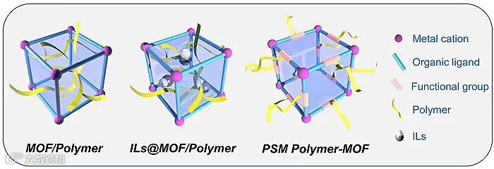 一方面,研究者将MOF作为固态填料与聚合物进行物理混合,制备了具有良好柔韧性的复合薄膜。另一方面,利用MOF中有机配体上的取代基,可以通过后合成 (PSM) 的方法进行聚合物接枝,或通过光聚合等方式原位组装成薄膜。这些复合材料不仅结合了MOF规则通道、高孔隙率、稳定性和开放活性位点等优点,还兼具了聚合物柔韧性及良好的界面接触等优点,作为锂离子电池固态电解质,展现了良好的性能。