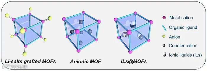 由于MOF结构的可调控性、多孔结构以及表面功能性,MOFs作为SSE为锂离子的传导提供了良好的通道。一方面,研究者通过在MOF上构造不饱和金属位点与锂盐的阴离子接枝,来限制阴离子在框架内的移动,提升了锂离子的快速传导。此外,还可以直接构造含有负电荷的框架,来提升锂离子的传导。然而,这样的框架中,锂离子的传导仍然是有限的,在室温下的离子传导率可以达到10-4~10-6数量级。另一方面,研究人员还通过负载离子液体的方式来提高SSE的电导率,这类IL@MOF材料表现出较高的离子导率,室温下达到10-3~10-5数量级。这类材料的系列研究工作,帮助我们理解了金属离子在MOF孔道中的传导机理,为未来MOF基SSE材料的开发应用提供重要的理论依据(图2)。