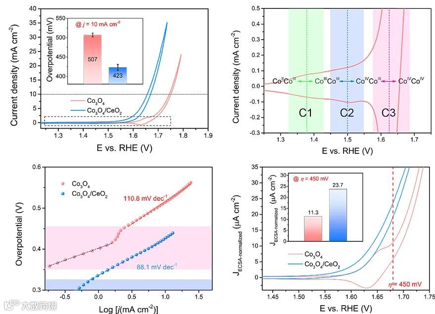 图1. Co3O4和Co3O4/CeO2纳米复合催化剂的酸性OER性能对比