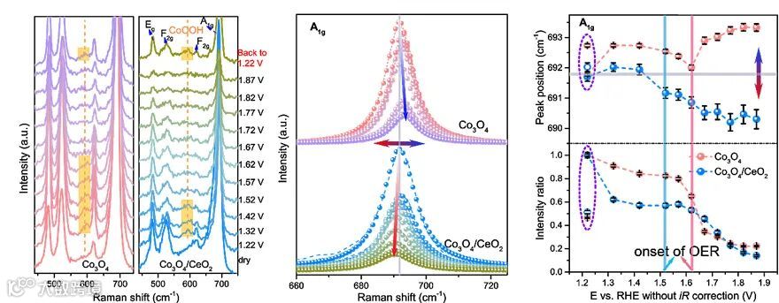 图2. Co3O4和Co3O4/CeO2纳米复合催化剂的原位Raman表征结果