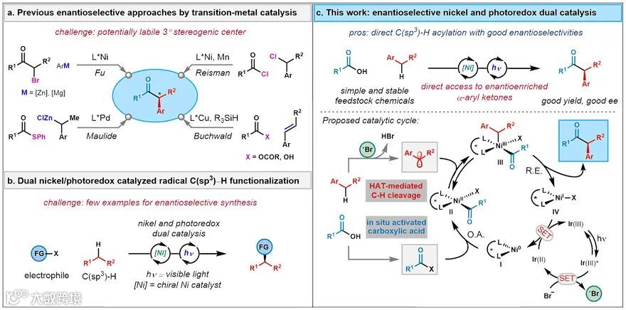 不对称C(sp3)-H官能团化是有机合成的一个持续挑战。那么,自由基型的不对称C(sp3)-H官能团化反应能否为这一挑战打开新的突破呢?近日,厦门大学的霍浩华教授团队通过镍和可见光协同催化的策略,报道了一例高效的苄位不对称C(sp3)-H官能团化反应用于合成α-芳基酮和酯。