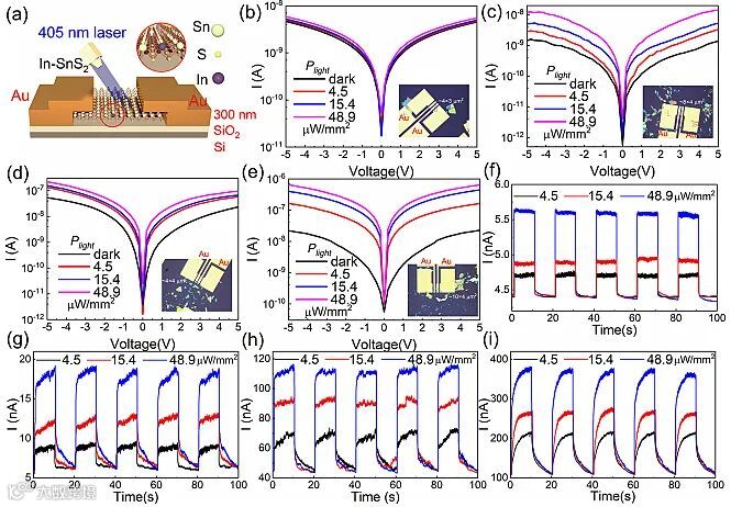 图2.(a)In-SnS2光电探测器的结构图;(b)SnS2光电探测器的I-V曲线;(c-e)0.9 %,1.4 %,1.9 % In-SnS2光电探测器的I-V曲线;(f)SnS2光电探测器的I-T曲线;(g-i)0.9 %,1.4 %,1.9 % In-SnS2光电探测器的I-T曲线。