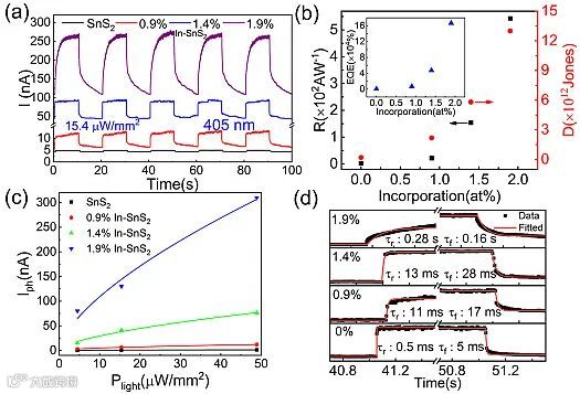这项工作创新性地提出了一种提高二维SnS2光探测性能的方法,适量地进行铟掺杂,对载流子迁移率、载流子密度、光生载流子产生-复合过程产生影响,实现二硫化锡光探测器的响应度、外部量子效率和归一化探测度的大幅地提高。