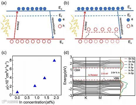 图4.(a)SnS2在光照下的能带示意图;(b)In-SnS2在光照下的能带示意图;(c)迁移率和掺杂浓度的关系;(d)DFT计算能带结构及In-SnS2的PDOS。