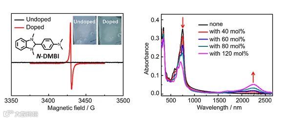 图2. 硼氮配位键n-型稠环芳烃掺杂前后的EPR信号图和UV-vis-NIR吸收光谱