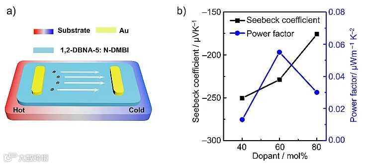 进一步制备了硼氮配位键n-型稠环芳烃的有机热电器件(图3),塞贝克系数为–244.4 μV K−1,功率因子为0.06 μW m−1 K−2。这个工作不仅报道了一类新型n-型有机热电材料,同时也为n-型有机热电材料的开发提供一种新的设计策略。