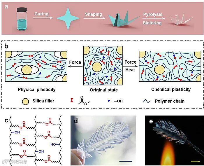折纸技艺历史悠久,在全世界广受喜爱,例如庆祝节日、制备手工艺品等。现如今,折纸技艺摇身一变,成为了一类富有潜力的工程技术,但往往只能应用在软质可变形的材料上。玻璃是一类不可或缺的工程材料,因其优良的物理化学性能(如光学透明度高、硬度大、耐物理/化学腐蚀等)具有广泛应用。具有复杂三维形状的玻璃有着很高的生产附加值,但其加工手段有限,传统的制备工艺一般需要高温熔融或化学刻蚀,加工条件较为苛刻。目前,3D打印,作为一类较为先进的复杂形状玻璃制备方法,往往受限于层层打印的机理,成型时间长,打印过程需要支撑,且材料表面粗糙度高,需要进行后续抛光。那么,有没有可能将折纸技艺与玻璃材料结合起来,制备“可以折”的玻璃呢?近日,浙江大学的谢涛团队以纳米二氧化硅-动态共价聚合物复合材料为先驱体,通过变形和高温处理,制备了三维透明折纸玻璃。