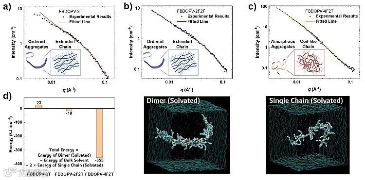 图1. a-c) 分别为FBDOPV-2T, FBDOPV-2F2T和FBDOPV-4F2T聚合物的中子散射实验和拟合结果 (内嵌图的左侧为聚合物在溶液中的聚集结构示意图,右侧为聚集体结构中的链构象);d) 分子动力学模拟计算的聚集过程的相互作用能以及溶剂化的二聚体和单根链的示意图 (以FBDOPV-2T为例予以展示)。