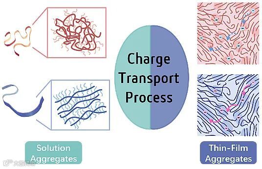 图2. 溶液聚集体与薄膜聚集体的载流子传输能力承袭关系示意图。