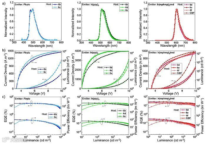 的电致发光光谱;b) 蓝(左)、绿(中)和红(右) PhOLED的亮度/电流密度-电压曲线;c) 蓝(左)、绿(中)和红(右) PhOLED的外量子效率/