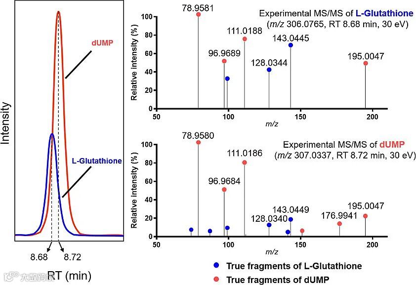 纯化代谢组学数据的重要性已经成为了代谢组学科研人员的共识。在过去的十几年中,大多数研究工作都是基于减少假阳性的代谢组学信号,以获取高置信度的(即对应于生物分子的)代谢分子信号。然而,相比于纯化代谢物分子信号,关于清洁二级质谱谱图方法的报道并不多,而且二级质谱谱图中杂质碎片离子的问题经常被忽视并且没有得到很好的研究。此外,尽管可以设置信噪比(S/N)或峰强度阈值来去除低丰度可疑峰或噪声峰,该策略却不适用于具有相似荷质比的化合物——杂质碎片离子的强度也可能很高(图1)。因此,开发一种可以识别液相色谱串联质谱数据中杂质碎片离子的方法对于纯化二级质谱谱图并获取高质量谱图数据至关重要。