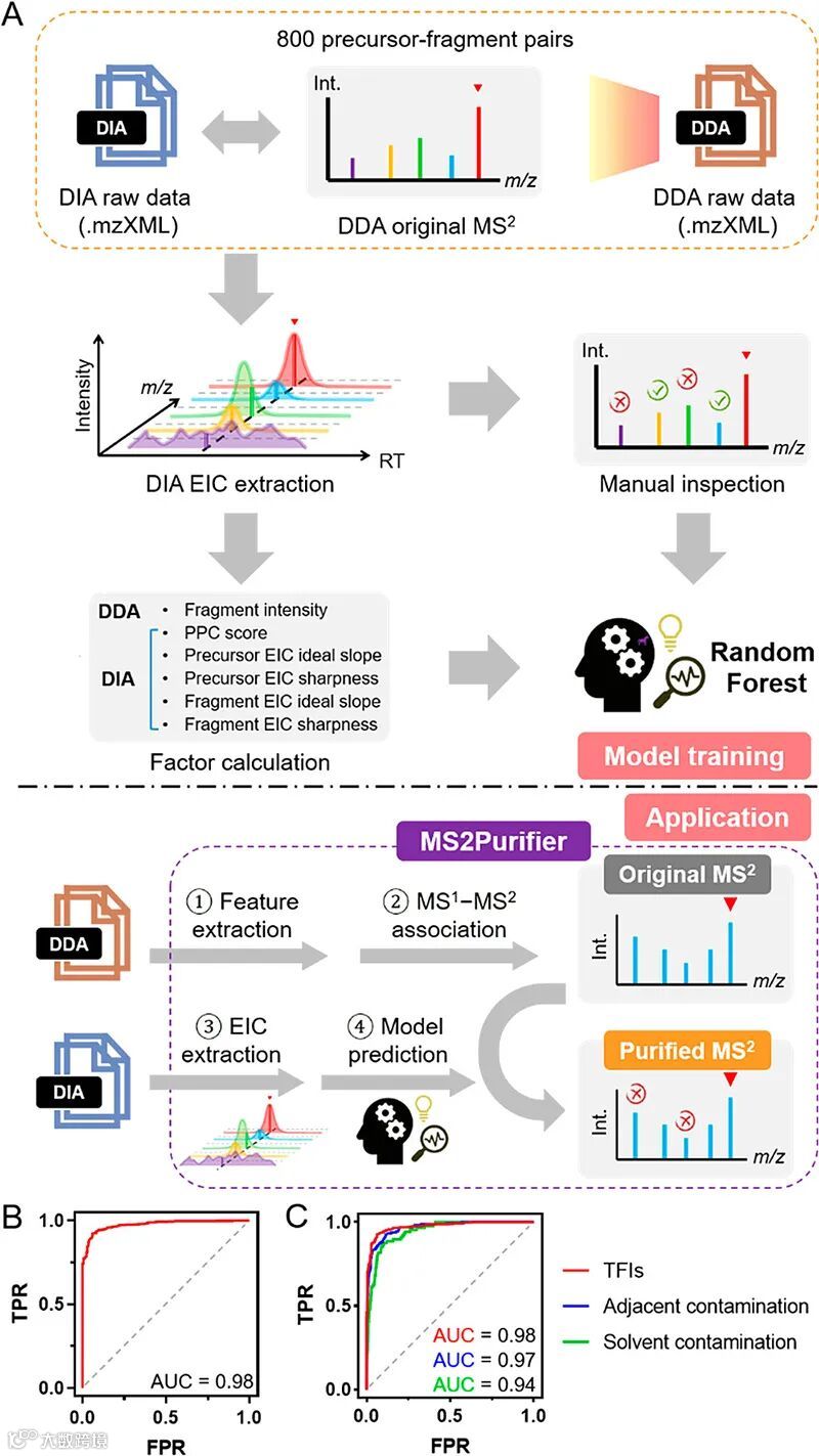 近日,英属哥伦比亚大学(The University of British Columbia)化学系还涛教授课题组提出了一种基于机器学习的全自动鉴定杂质碎片离子的策略,MS2Purifier,可实现对液相色谱串联质谱采集的DDA数据集中二级质谱谱图的高效纯化。该研究结果发表在国际质谱权威杂志Journal of the American Society for Mass Spectrometry 上。文章第一作者为英属哥伦比亚大学博士研究生邢世沛,通讯作者为英属哥伦比亚大学还涛教授。