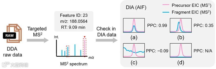 杂质碎片离子的独特之处是它们不必与目标前体离子共洗脱出来。遵循该原理,研究人员建立了一种新颖的分析工作流程(图2)以识别二级质谱谱图中可能存在的杂质碎片离子。在此工作流程中,通过在同一代谢组学样本的平行的数据依赖性采集的数据分析中检查其提取离子色谱,可以识别潜在的杂质碎片离子。由于真实碎片离子应该与其前体离子共洗脱,因而前体离子的一级质谱谱图提取离子色谱和碎片离子的二级质谱谱图提取离子色谱之间应有着很高的峰-峰相关系数(PPC)。相反,杂质碎片离子相对于前体离子的PPC分数则较低。