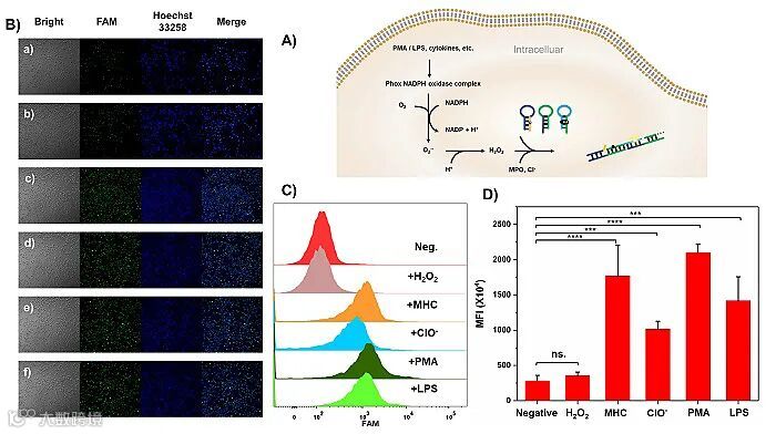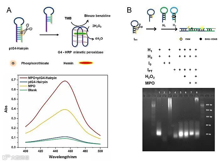 该论文首先研究了该体系对 PT 修饰的双链和单链 DNA 进行位点特异性切割的可行性,并验证了MHC系统切割硫代修饰DNA的机理。随后,该团队构建了PT 修饰的两种不同功能的 DNA 发夹结构(ptG4-Hairpin和ptHCR-Hairpin)以验证这种定点切割用于分子机器构建的能力。通过MHC体系剪辑后,ptG4-hairpin可与血红素一起转化为G4-HRP DNA模拟酶(图2A);ptHCR-Hairpin被切割后,可以直接诱导杂交链式反应 (HCR) ,这使得功能核酸链发生串联自组装产生信号放大,并成功地应用到活细胞氧化应激反应成像分析中(图2B和图3)。