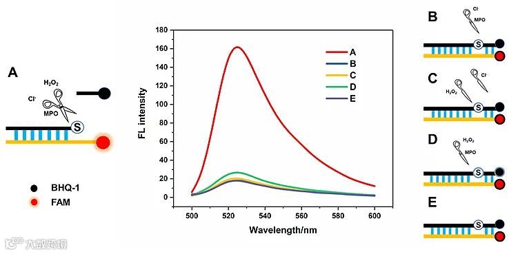 目前内源性DNA编辑工具相对较少,开发内源性的核酸切割策略,并将其应用到单细胞分析中很有意义。最近清华大学的研究人员发现髓过氧化物酶的氯化氧化反应过程可以对硫代磷酸酯 (PT) 修饰的 DNA 进行准确的位点特异性切割(图1)。该DNA剪切系统由 MPO、过氧化氢(H2O2)和氯化物(Cl-)组成(MHC 系统)。MPO催化H2O2和Cl-生成次氯酸,进而通过次氯酸对硫代位点进行特异性切割。