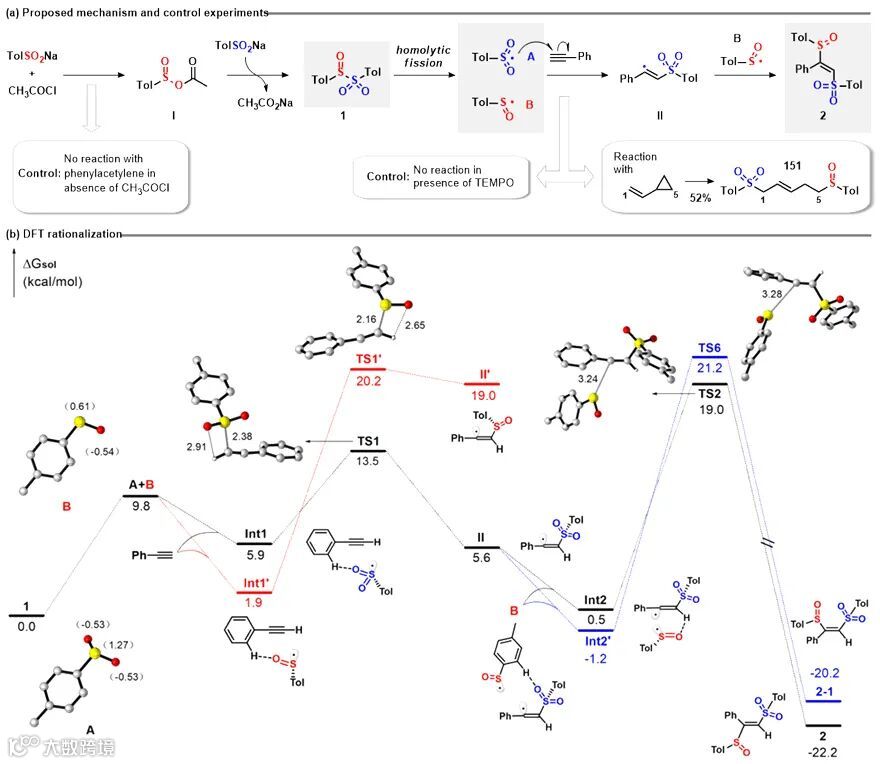 为了深入研究不饱和烃亚砜砜化的反应机制,作者设计并进行了控制实验(Figure 8a)。结果表明,在反应过程中亚磺酸钠与乙酰氯首先发生亲核取代反应,生成活性中间体I,活性中间体I再与另一分子的亚磺酸钠发生阴离子交换即可得到亚砜基砜1。亚砜基砜1在温和条件下发生裂解生成砜基自由基和亚砜基自由基,砜基自由基具有更高的反应活性,首先与炔烃发生自由基加成反应生成碳中心自由基中间体II,碳中心自由基中间体II进一步与亚砜基自由基发生自由基交叉偶联反应即可得到目标产物2。随后,作者还利用DFT理论计算对其具体反应机制的细节进行了合理化(Figure 8b)。