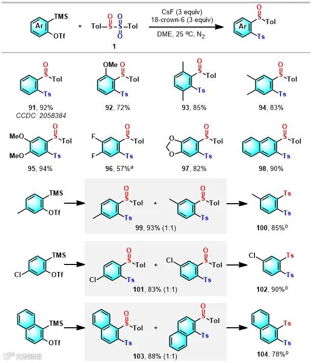 在稍微改变一下反应条件且直接采用亚砜基砜1作为硫化试剂时,此策略同样适用于苯炔的亚砜砜化反应,为多官能化芳烃的制备提供了一条新路线(Figure 5)。