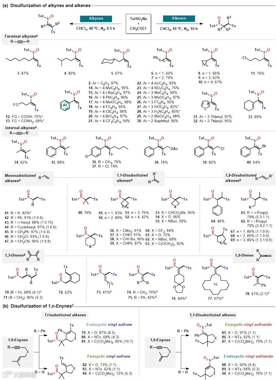 在了解亚砜基砜的性质以后,作者对其在有机合成中的应用进行了研究,发现它们是一类很好的砜基自由基和亚砜基自由基的前体,在温和条件下即可与各种不饱和烃(包括端炔、内炔、端烯、内烯、共轭二烯烃、联烯及烯炔体系)发生自由基加成-偶联反应,为同时包含亚砜基和砜基的有机硫化物的制备提供了一种简单、高效的方法(Figure 4)。