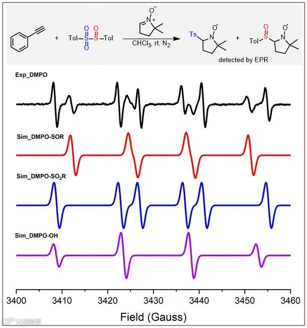 最后,作者为了清晰证明该反应包含砜基自由基和亚砜基自由基,以DMPO作为自由基捕获剂,对反应体系进行了EPR实验研究(Figure 9)。实验结果表明,在反应体系中的确有两组自由基的信号峰,经过理论模拟证实,该两组自由基的信号峰分别属于砜基自由基与DMPO加合物和亚砜基自由基与DMPO加合物的信号峰。