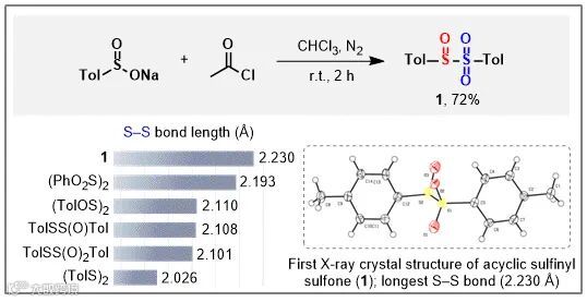 在本文中,亚砜基砜1由亚磺酸钠和乙酰氯在氯仿中制备。从亚砜基砜1的核磁上来看,两个苯环及两个甲基上的氢和碳的化学位移均不相同,这说明此类化合物是一个非对称的结构。从亚砜基砜1的单晶数据上来看,亚砜基砜1中的S-S键长为2.230 Å,比其他同类型的二硫化物的S-S键键长(Figure 2)要长,这样即可从分子结构特点上明确亚砜基砜类化合物高度不稳定的原因。
