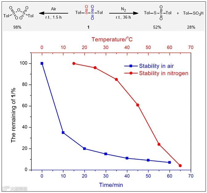 为了深入了解亚砜基砜类化合物,接下来作者对其不稳定性开展研究。作者分别考察了亚砜基砜1对空气的敏感性及其在氮气氛围中对温度的敏感性(Figure 3)。从蓝色曲线中可以看出,亚砜基砜1的氘代氯仿溶液在室温条件下、空气中搅拌10 min时即大约有65%的1被氧化为磺酸酐,在60 min时只有不到5%的化合物1剩余。考察亚砜基砜1在氮气氛围中对温度的敏感性时,作者发现化合物1固体及氘代氯仿溶液在氮气氛围中可于-18 ℃下储存四个月且不发生变化,但是其氘代氯仿溶液在氮气氛围中、室温条件下搅拌36 h后即完全发生转化,生成硫代硫酸酯和对甲苯磺酸。同时,作者还绘制了化合物1的氘代氯仿溶液在氮气氛围中、30 min时随温度变化的变化曲线。从红色曲线中可以看出,化合物1在15 ℃条件下30 min时基本没有发生变化,在35 ℃时化合物1开始快速分解,而在65 ℃时,其剩余量不到4%。