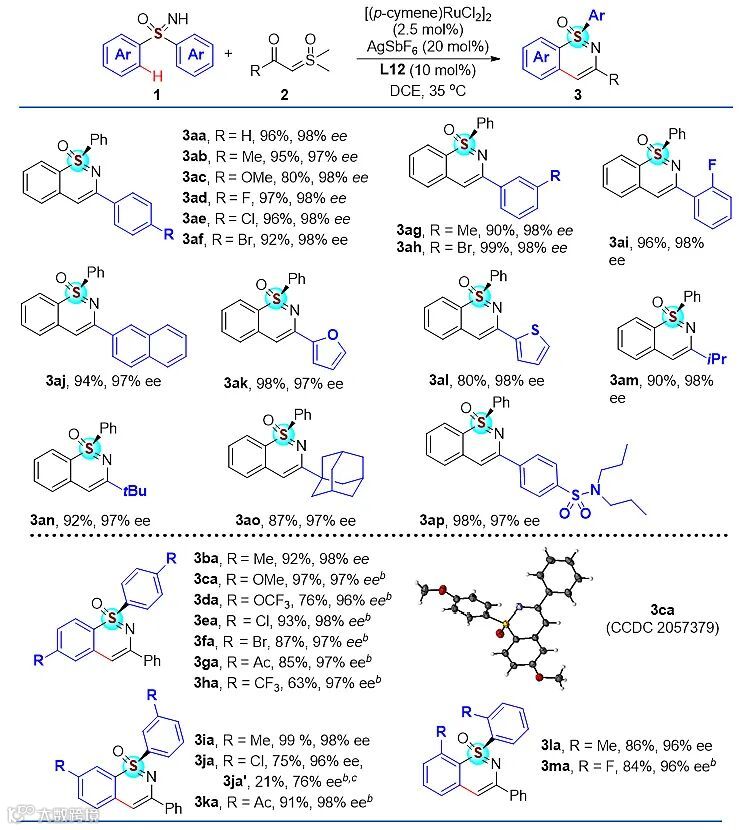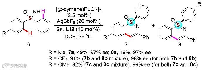 浙江大学化学系史炳锋团队通过设计合成了一类新的手性羧酸配体,实现了首例Ru(II)催化的通过碳氢键活化产生手性中心的不对称官能团化反应。该反应体系对于去对称化,动力学拆分,平行动力学拆分都能有很好的底物兼容性。同时反应生成的高光学纯的手性亚砜亚胺有较为广阔的应用前景。