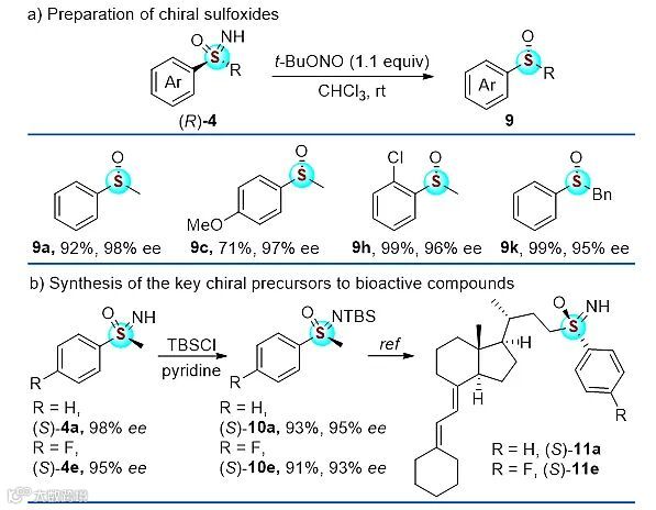 为了进一步展示该反应潜在应用价值,研究者对该反应进行了衍生化研究(图5)。动力学拆分所得的手性磺酰亚胺经过简单的还原可以得到在不对称催化反应中应用广泛的手性亚砜配体。同时,手性亚砜亚胺是诸多具有良好生物活性药物的关键骨架,研究者将拆分所得的手性磺酰亚胺经过简单的转化,及可以得到人细胞色素P450C24(CYP24)羟化酶11的抑制剂的前体。因此这一催化体系在药物化学中也有较为广阔的应用前景。