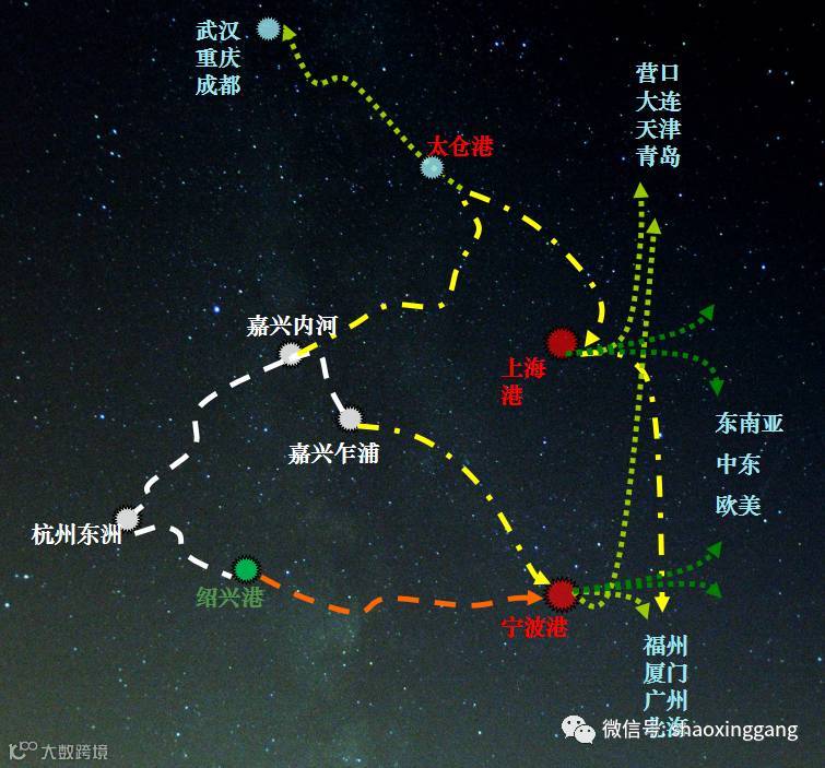 水路经杭甬运河东接宁波镇海港,西经钱塘江与京杭运河相连上海港、宁波港、乍浦港、太仓港、南通港等母港,水水中转航线互通国内外各大港口。