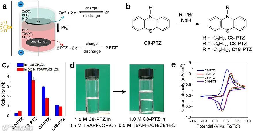 水系电解液中含有ZnSO4和KPF6,而非水系电解液中含有吩噻嗪和TBAPF6。充电过程中,正极电解液中的吩噻嗪被氧化生成吩噻嗪自由基阳离子并从水系电解液中得到阴离子PF6–,而水系电解液中的Zn2+则在锌板上发生沉积,放电过程与之相反(图1)。在整个中放电过程中,阴离子PF6–作为载流子在水系/非水系电解液界面上来回穿梭,维持电荷平衡。吩噻嗪N位烷基链的长度首先会影响吩噻嗪衍生物在非水系电解液中的溶解性。研究发现,原始的吩噻嗪在二氯甲烷电解液中的溶解性很低,而烷基取代基的引入有助于提高吩噻嗪溶解性。同时,烷基取代基也会降低吩噻嗪分子的HUMO能级,提高吩噻嗪峰氧化还原电位。