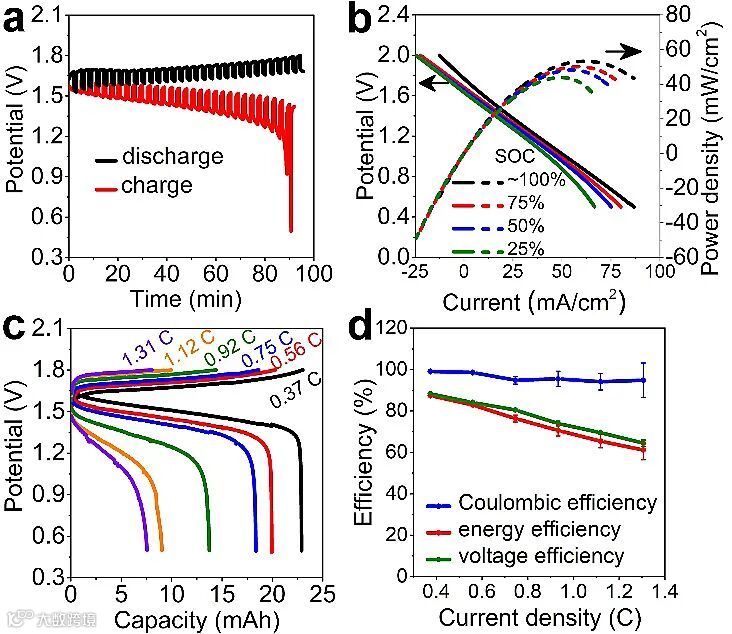 研究人员随后又着重探究了Zn/C8-PTZ电池的其他电池性能(图3)。恒电位间歇滴定表明电池在高荷电状态下的极化要低于在低荷电状态下的极化,这可能是因为氧化得到的吩噻嗪自由基的动力学参数更高的缘故。不同荷电状态下的电池极性极化测试表明Zn/C8-PTZ电池的最大功率密度达到53.5 mW/cm2。研究人员同时分析了Zn/C8-PTZ电池的在不同电流密度下的倍率性能。电池的放电容量随着电流密度的增加显著降低,这可能是因为两个电极(水系电解液中的锌板和非水系电解液中的碳毡)距离较大而导致内部阻抗较大的缘故。