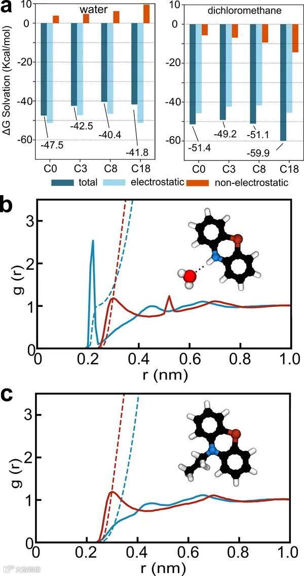 研究人员又通过计算溶剂化自由能以及分子动力学仿真技术探究烷基链的长度对吩噻嗪自由基阳离子亲水性的影响(图4)。溶剂化自由能的结果表明各种吩噻嗪自由基阳离子在非水系的二氯甲烷体系中具有更高的溶解性。分子动力学仿真表明吩噻嗪自由基阳离子与溶剂之间相互作用的位点是N原子和S原子,当烷基链的长度增加时,吩噻嗪的N原子和水分子之间的静电相互作用减弱,进而降低了在水系电解液中的溶解性。