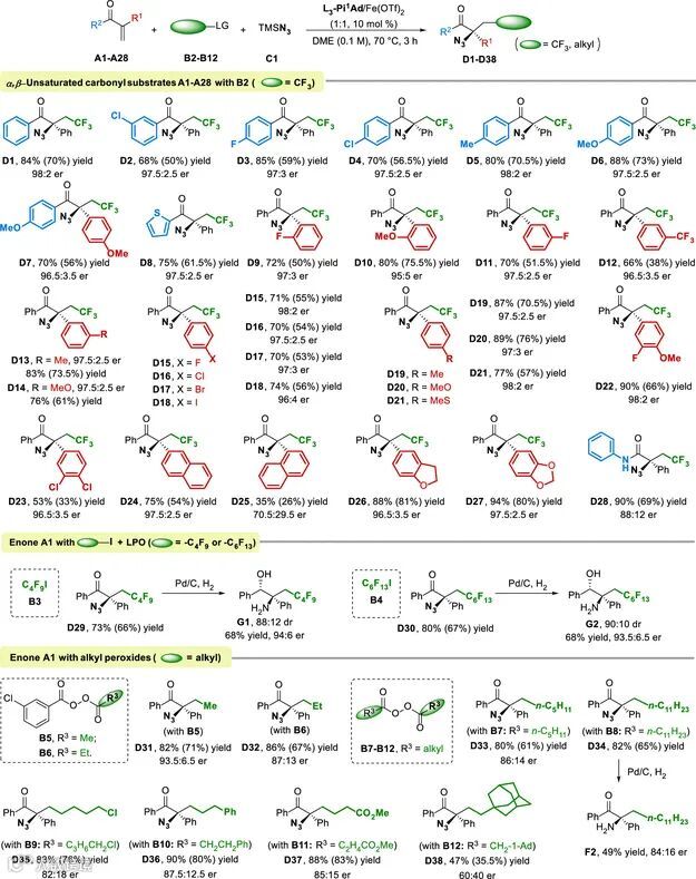 该反应表现出优异的底物普适性。一系列芳环、杂环取代的烯酮、烯酰胺均能以较高的对映选择性转化为相应的三氟甲基叠氮化产物。同时,全氟烷基碘代物和烷基过氧化物也可以作为理想的碳自由基前体,得到一系列烯烃的碳叠氮化产物(图2)。