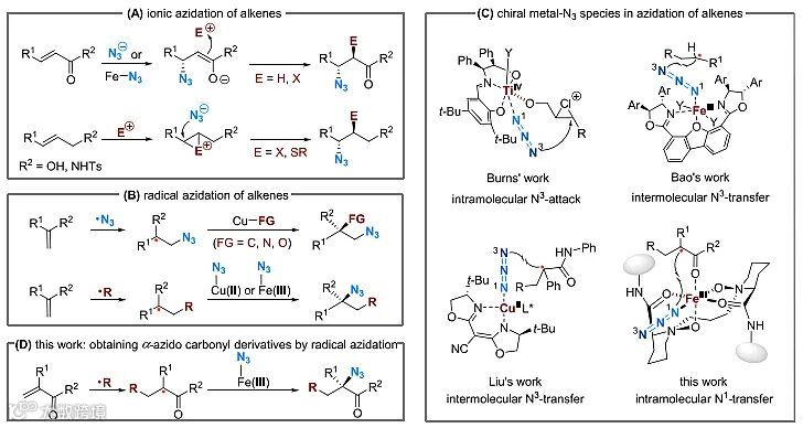 有机叠氮化合物,不仅可以作为有机合成中重要的中间体参与一系列的转化,同时也在材料、生物、医药等领域应用广泛。通过烯烃的双官能化引入叠氮基团,是一种高效合成有机叠氮化合物的手段。该方法主要分为两种途径,一种是已经发展较为成熟的离子型加成(图1A);另一种则是通过自由基加成实现烯烃的叠氮官能化(图1B)。虽然目前关于烯烃的自由基叠氮化已有许多报道,但是绝大多数都是消旋体,实现烯烃的不对称自由基叠氮化仍然存在较大的挑战。手性金属-叠氮物种可以有效地用于构建手性叠氮化合物(图1C)。此前,四川大学冯小明课题组通过离子型加成途径实现了α,β-不饱和羰基化合物的卤叠氮化反应,在反应过程中检测到Fe-N3物种的生成(J. Am. Chem. Soc., 2017, 139, 13414−13419; Org. Lett., 2019, 21, 1170−1175)。