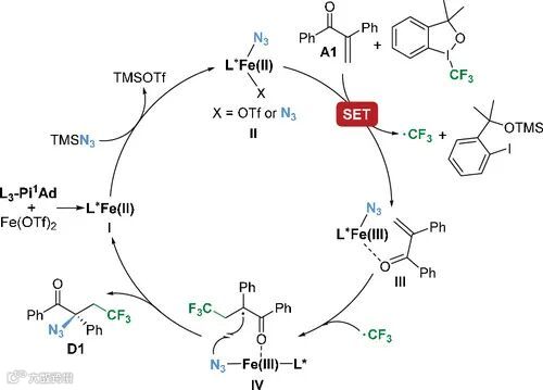 根据控制实验以及机理研究,作者提出了可能的反应机理(图4)。首先,手性双氮氧配体与Fe(OTf)2原位生成手性Lewis酸催化剂I。该催化剂与TMSN3发生配体交换得到II,随后被Togni试剂氧化,生成三氟甲基自由基和中间体III。在这一步骤中,底物A1与催化剂配位发生在氧化之前或之后均有可能。三氟甲基自由基加成到烯烃的端位得到自由基中间体IV。最后叠氮基团从Fe(III)转移至自由基,生成最终产物D1,释放出催化剂。