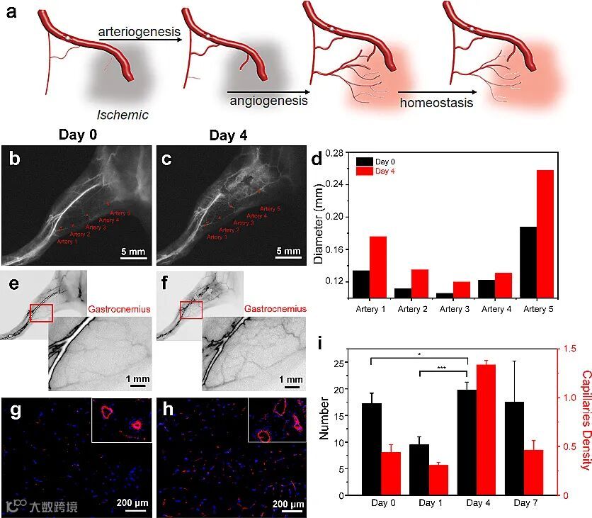 图2. Au:Ag2Te量子点活体原位、无创监测缺血后肢模型中的血管生成和动脉生成过程。