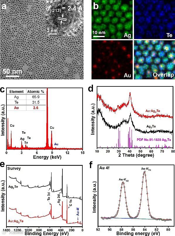 Ag2Te是一种窄带隙(0.06 eV)、低溶解度(Ksp = 2×10-72),且不含高毒性重金属离子的半导体材料,是理想的NIR-IIb量子点体系。然而Ag2Te的光致发光量子产率(PLQY)较低,这可能归因于Ag离子高迁移率导致的阳离子空穴和晶体缺陷。为了解决这一问题,近期,中国科学院苏州纳米技术与纳米仿生研究所王强斌研究员课题组基于前期的工作基础,使用阳离子交换法,首次合成了具有NIR-IIb区荧光发射的Au掺杂Ag2Te(Au:Ag2Te)量子点。通过控制Au前驱体与Ag2Te量子点的投料比,可以有效调控Au元素的掺杂量。当Au的掺杂量为4%时,Au:Ag2Te量子点的荧光发射位于1600 nm,相较于Ag2Te量子点,荧光增强约12倍。通过对该量子点进行表面功能化,Au:Ag2Te量子点保持高NIR-IIb荧光强度、高胶体稳定性、高光稳定性以及良好的生物相容性。进一步,Au:Ag2Te量子点成功实现了活体原位、无创监测缺血后肢模型中的血管再生和动脉生成过程。