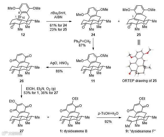 作者随后展开了倍半萜醌dysideanone B(1)的全合成。利用分子内的自由基反应将单烯12转化成具有dysideanone B(1)的6/6/6/6四环骨架的酮24,随后通过Wittig反应和氧化反应将酮24转化为醌26,最后在碱性条件下引入乙氧基就完成了倍半萜醌dysideanone B(1)及其区域异构体27的首次全合成,并且在酸性条件下将dysideanone B(1)转化为了可能的天然产物dysideanone F(9)。
