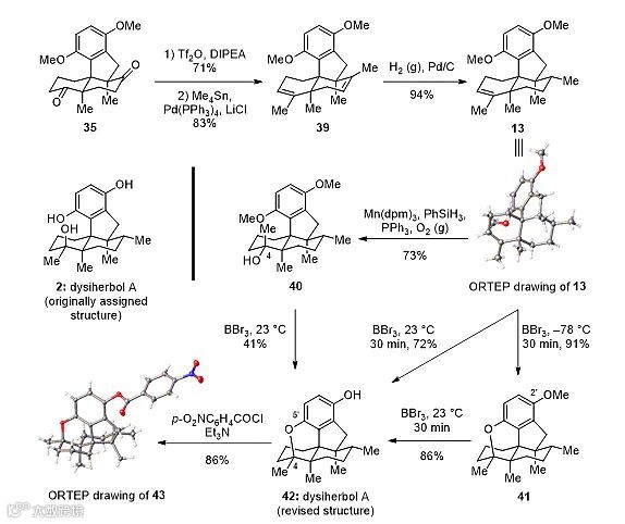 作者最后完成了倍半萜氢醌dysiherbol A(2)的全合成。首先将二酮35中的两个酮羰基转化为环内烯烃得到二烯39,选择性地将二烯39中的一个烯烃立体选择性还原得到单烯13。作者发现单烯13通过Mukaiyama水合只能得到羟基构型相反的醇40,用BBr3脱除醇40的甲基保护基时,没有得到预期的对苯二酚,而是得到了含有新骨架的副产物42,而42与天然产物dysiherbol A(2)的光学特征全部一致,作者通过42的衍生物43的晶体X-射线衍射确定了dysiherbol A的结构。此外,作者还发现单烯13在BBr3作用下可以一步得到dysiherbol A(42)。