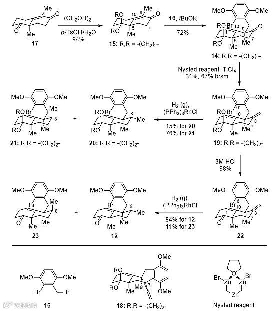 根据生源合成假说,作者首先进行关环前体20和12的合成。从Wieland–Miescher酮衍生物17出发,选择性地保护非共轭的酮羰基得到酮15,然后利用分子间立体和位点选择性的烷基化反应将酮15与苄溴16连接起来得到三环酮14,紧接着通过亚甲基化反应将三环酮14的羰基转化为环外双键得到二烯19。作者发现,在Wilkinson催化剂条件下,二烯19的选择性氢化反应的d.r.值为1:5,而脱除缩酮之后的二烯22的选择性氢化反应的d.r.值为8:1。