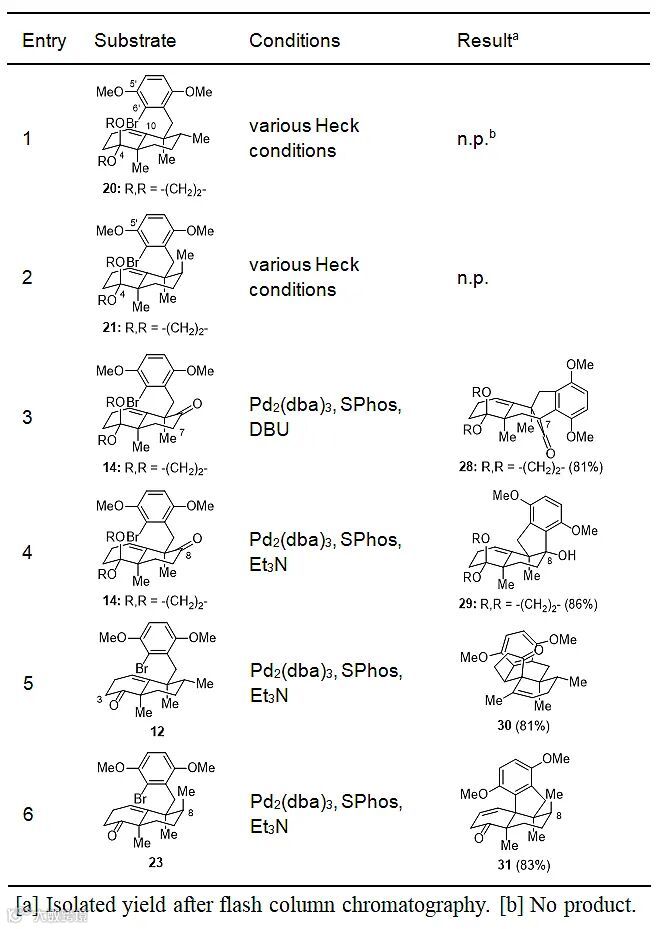 作者在构建倍半萜氢醌dysiherbol A(2)的6/6/5/6四环骨架时遇到了挑战。分别尝试了含有缩酮的底物20、21和14的Heck反应,均未得到预期的关环产物。作者还发现,酮12在Pd2(dba)3作催化剂、SPhos作配体、Et3N作碱时发生的Heck反应得到了重排产物30,而C8位甲基构型相反的酮23在相同的Heck条件下得到了预期的关环产物31。