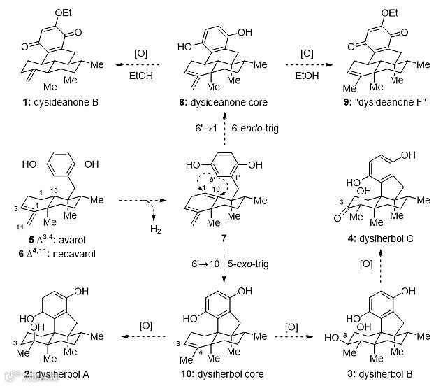 作者通过分析dysideanone B(1)和dysiherbol A(2)以及相关天然产物的结构特征,认为dysideanone B(1)和dysiherbol A(2)可能来源于同家族的天然产物avarol(5)或neoavarol(6)。Avarol(5)或neoavarol(6)脱氢可以得到二烯7,二烯7通过6-endo-trig的方式关环可以得到dysideanone B(1)的6/6/6/6四环核心骨架8,而通过5-exo-trig的方式关环则可以得到dysiherbol A(2)的6/6/5/6四环核心骨架10。