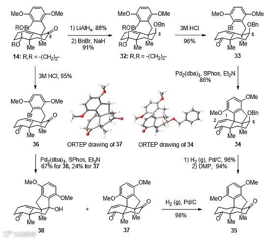 受到酮23发生Heck反应可以得到预期关环产物的启发,作者尝试调整C8位的官能团来构建dysiherbol A(2)的6/6/5/6四环骨架。酮14依次经过还原、引入苄基保护基以及脱除缩酮保护基得到关环前体33,关环前体33可以发生预期的分子内Heck反应,从而构建具有dysiherbol A(2)的6/6/5/6四环骨架的酮34,紧接着同时将酮34中的双键还原、苄基脱除,然后将所得到的醇氧化得到二酮35。作者还发现二酮35也可以由酮14先脱除缩酮保护基、再发生分子内的Heck反应、最后将生成的环内双键还原得到。