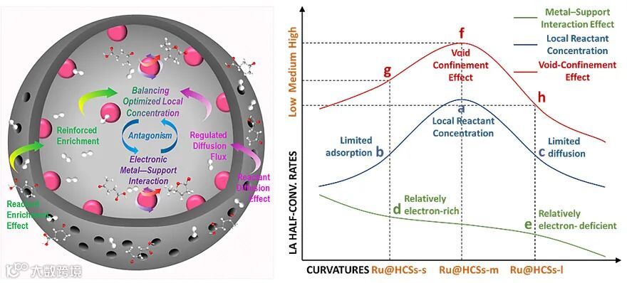 日前,西藏大学吕学斌、天津大学纪娜、中国科学技术大学张李东合作发表研究文章,基于生物质基乙酰丙酸加氢探针反应解析了MHC纳米反应器空腔限域效应的形成机制。文章表明:(1)MHC纳米反应器的空腔限域效应本质上是一种由电子金属—载体作用效应、底物富集效应与底物扩散效应叠加形成的综合性效应;(2)中空碳球弯曲结构的应力变化将导致电子金属—载体作用的变化,并进一步引发所担载金属纳米颗粒电子结构的改变进而影响其对反应物的吸附与活化;(3)中空碳结构会诱导底物富集与扩散行为之间的平衡效应,并在最佳结构参数下实现相对较优的空腔内部底物浓度;(4)底物“富集—扩散”平衡效应与电子金属—载体作用效应之间呈现拮抗性关系,并共同决定最终的催化效率。此研究为MHC纳米反应器微环境效应的理解、控制与利用提供了理论支撑,并进一步展示了其在构建可持续生物质能源催化体系中的潜在优势。