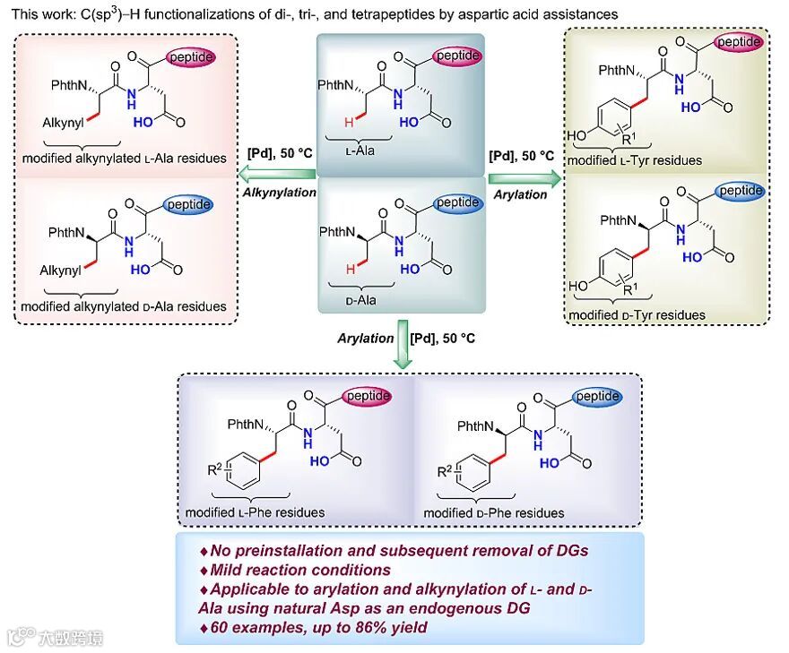 导读:浙江工业大学制药工程系翁意意副教授课题组利用天然的天冬氨酸(Asp)作为内源性导向基团进行多肽后期C(sp3)−H活化反应的研究。在温和的条件下(50 °C),该研究实现了多肽序列中L-和D-丙氨酸的