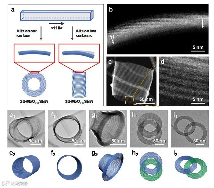 近日,清华大学王训教授和西北工业大学杨勇教授团队发现材料表面缺陷的不对称分布对螺旋结构的形成至关重要。研究人员以MoO3-x亚纳米线为研究对象,成功得到了具有不同组装形式的纳米螺旋结构。其中,亚纳米线只在平面内卷曲形成的是二维螺旋结构,而进一步在平面外卷曲则可以形成三维螺旋结构。理论计算结果进一步表明,面内和面外两种不同卷曲方式的形成是由于表面氧缺陷的不对称分布造成的。当只在一个表面上存在不对称缺陷时,亚纳米线只会在平面内卷曲;而当两个表面上均存在不对称缺陷时,亚纳米线可以同时在平面内和面外卷曲。由于氧缺陷引起的局域表面等离子体共振,MoO3-x亚纳米线在近红外光区表现出优异的吸光能力,并且在水溶液和水凝胶基质中均具有良好的光热转换性能。这一工作不仅为设计复杂的无机螺旋结构提供了一种新的方法,还为研究具有刺激响应特性材料的可控自组装提供了新的思路。