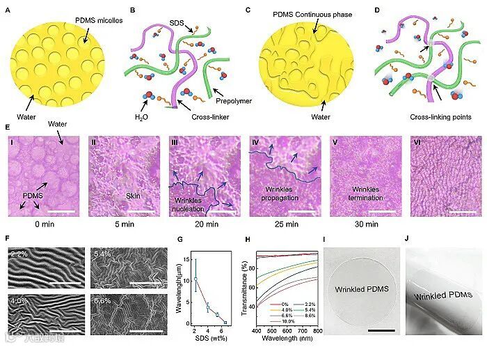同时系统研究了PDMS薄膜表面褶皱生长过程,分为破乳、生成表层、褶皱形核、褶皱生长与褶皱终止五个过程。在第一阶段,PDMS乳液在受热状态下发生破乳,PDMS开始聚合,并在第二阶段,形成表层结构。随着反应持续进行,基体中水分不断蒸发,在表层形成压应力,薄膜表层开始收缩。在第三阶段,表面不稳定区域首先开始出现褶皱,并且在第四阶段,褶皱结构不断向周围扩展,最终在第五阶段,表面完全生成褶皱结构。通过改变体系中水分含量,可以对褶皱波长进行调控(250 nm-10.5 μm),当褶皱波长为250 nm时,薄膜表现出良好的柔性与透明性(图2)。