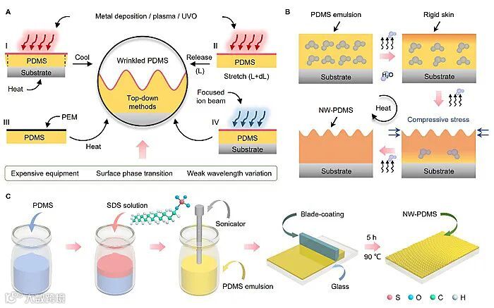 褶皱结构广泛存在于日常生活中,如时光流逝在我们眼角留下的褶皱,水分蒸发在水果表面产生的褶皱。虽然褶皱有时困扰我们的生活,但是其为材料世界却带来诸多新奇现象。褶皱结构可以调控材料机械性能、光学性能以及润湿性能等,在可调控光学、生物医疗、清洁能源以及可穿戴电子等领域具有广泛应用。聚二甲基硅氧烷(PDMS)因具有制备简单、生物相容性、可拉伸性及透明度高等优点,是褶皱结构的主要研究材料。而目前PDMS褶皱薄膜的制备主要通过等离子体、紫外光辐照或金属薄膜沉积,结合预拉伸或加热冷却的方式实现,这些手段往往需要昂贵的设备,无法大规模制备,并且难以构建纳米尺度褶皱,限制了褶皱结构材料的商业化与进一步应用。