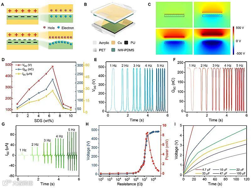 PDMS电负性较大,是良好的摩擦电材料,在其表面制备褶皱结构,可以增加其表面积,提高表面电荷密度,进一步提高摩擦纳米发电机(TENG)输出。研究人员制备了基于纳米褶皱薄膜的TENG器件,与平面薄膜相比,其输出电压、转移电荷与短路电流分别提升了219%、279%以及511%。器件输出功率为8.5 mW,并在2 Hz工作频率下,可于120 s内将容量为22 μF和100 μF的电容器充电至4.7 V和2.2 V(图3)。