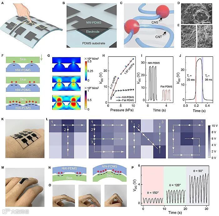此外,基于纳米褶皱PDMS薄膜,研究人员制备了柔性触觉传感器,其基本结构包括PDMS基底、柔性电极和纳米褶皱功能层。得益于纳米褶皱结构,传感器在低压力下展示出良好的输出性能,与平面PDMS薄膜器件相比,基于纳米褶皱PDMS薄膜的器件的灵敏度提升了64%,并表现出较快的响应速度。最后,由于PDMS的天然粘附性,触觉传感器阵列可以自发粘附在人体皮肤上,并通过输出电压矩阵来识别手指移动路径(T、E、N和G),将传感器贴于手指关节上,可以监测手指的弯曲状态。该传感器在表皮电子学和人机界面中表现出潜在应用价值(图4)。