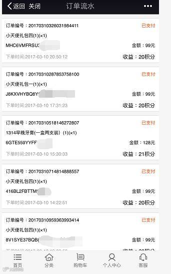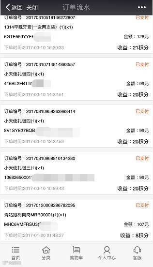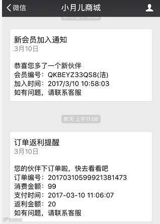4、当你的朋友的朋友又通过扫描你的朋友的小月儿商城二维码关注小月儿商城,同样下单购买了其中一种99元的小天使礼包之后,你就又会收到返利提醒,奖励29元,同样的,这29元也是以积分的形式存在,累计达100积分,可提现。(ps:这100积分是待定积分,7个工作日之后就自动变成可用积分了,就可以提现啦)。